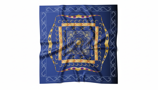100% Silk Charmeuse Square Scarf Modern Mandala Blue Gold No 8
