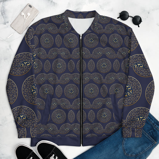 Unisex Bomber Jacket Kukloso Mandala No 57 B Gold on Navy Free Shipping