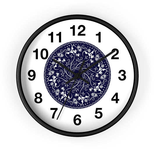 Wall Clock Kukloso Mandala No 155 White Florals on Navy - Free Shipping