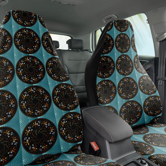 Car Seat Cover - AOP Kukloso No 155 Mandala design, Aqua-Black on Black - Free Shipping