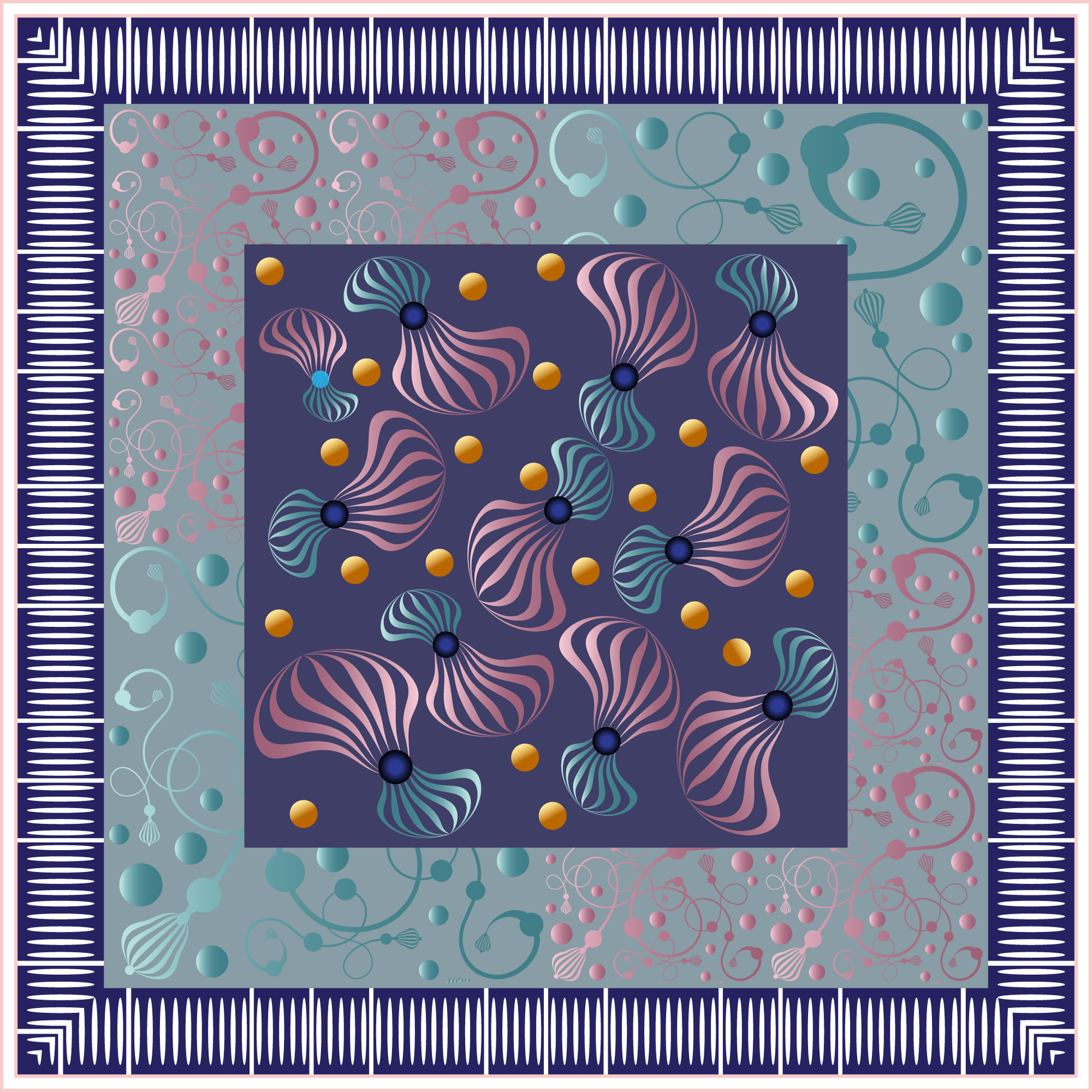 100% Silk Charmeuse Square Scarf Graphic Spirals Aqua and Pink