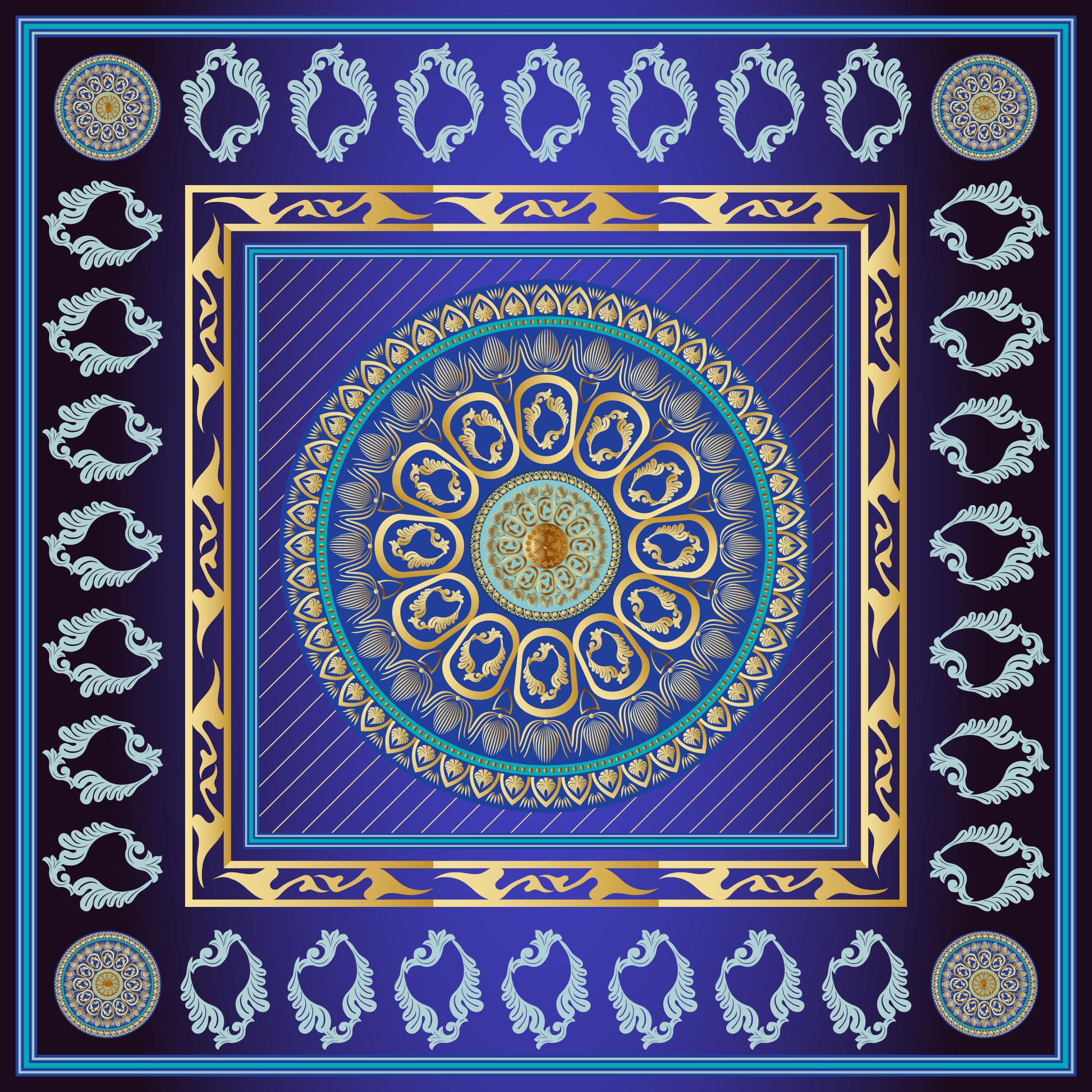 100% Silk Charmeuse Square Scarf Mandala in Blue