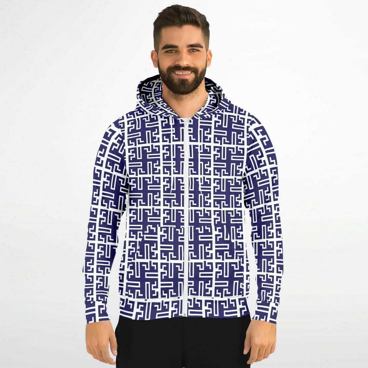 Fashion Zip-Up Hoodie - AOP Kukloso Greek Border No 54 White on Navy - Free Shipping